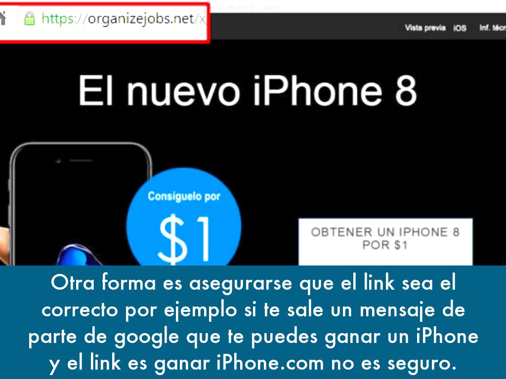 Otra forma es asegurarse que el link sea el correcto por ejemplo si te sale un mensaje de parte de google que te puedes ganar un iPhone y el link es ganar iPhone.com no es seguro.