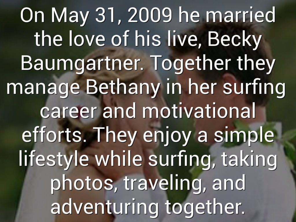 On May 31, 2009 he married the love of his live, Becky Baumgartner. Together they manage Bethany in her surfing career and motivational efforts. They enjoy a simple lifestyle while surfing, taking photos, traveling, and adventuring together.