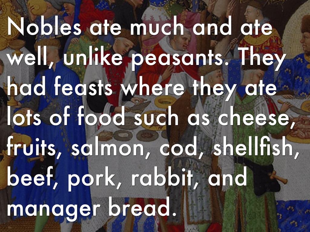 Nobles ate much and ate well, unlike peasants. They had feasts where they ate lots of food such as cheese, fruits, salmon, cod, shellfish, beef, pork, rabbit, and manager bread.