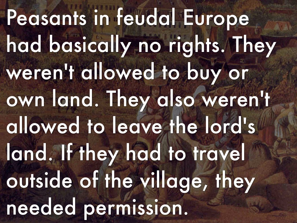 Peasants in feudal Europe had basically no rights. They weren't allowed to buy or own land. They also weren't allowed to leave the lord's land. If they had to travel outside of the village, they needed permission.