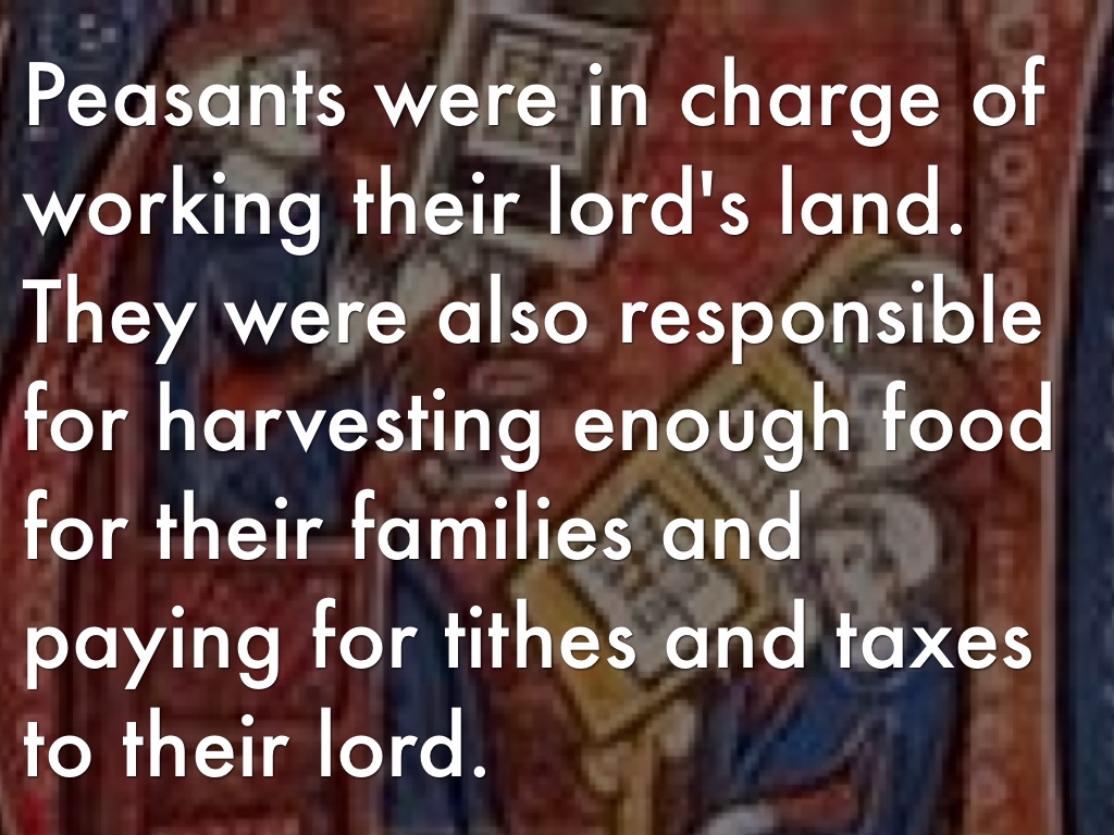 Peasants were in charge of working their lord's land. They were also responsible for harvesting enough food for their families and paying for tithes and taxes to their lord.