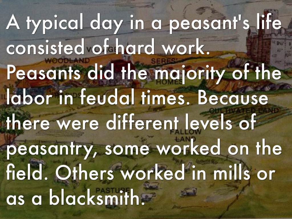 A typical day in a peasant's life consisted of hard work. Peasants did the majority of the labor in feudal times. Because there were different levels of peasantry, some worked on the field. Others worked in mills or as a blacksmith.