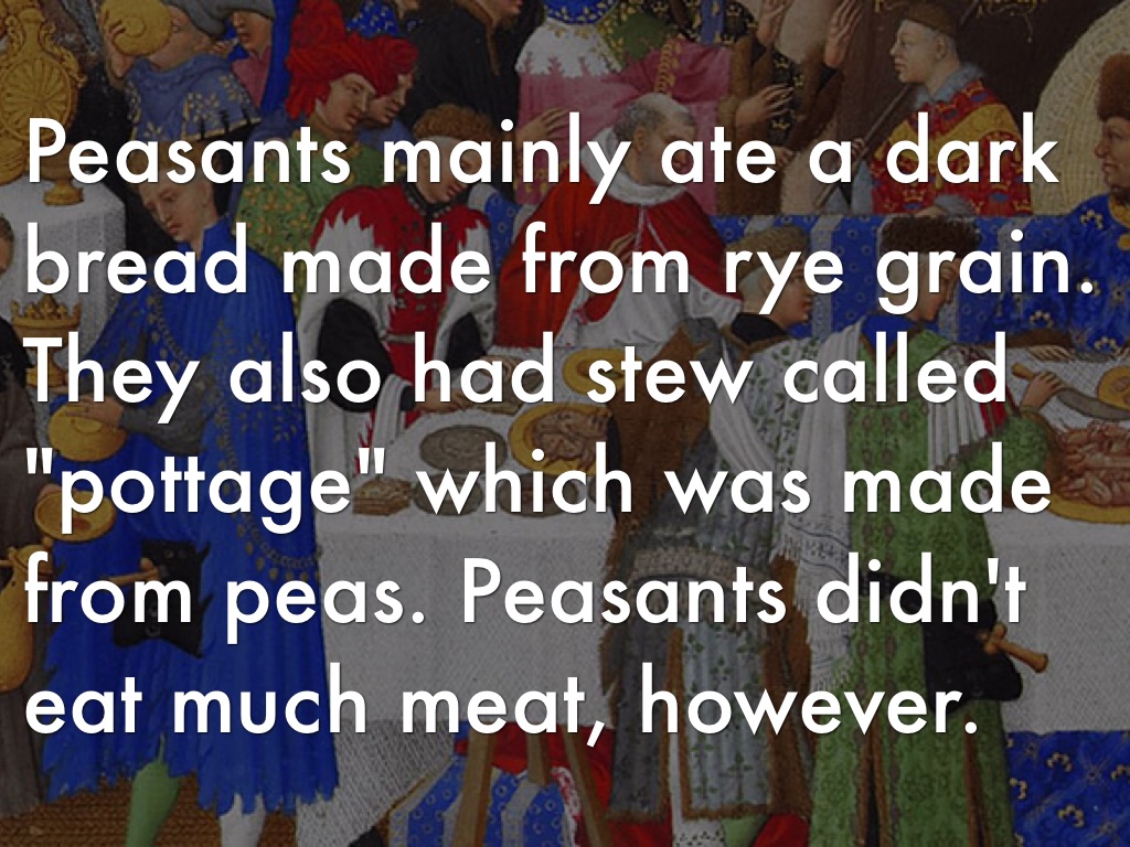Peasants mainly ate a dark bread made from rye grain. They also had stew called "pottage" which was made from peas. Peasants didn't eat much meat, however.
