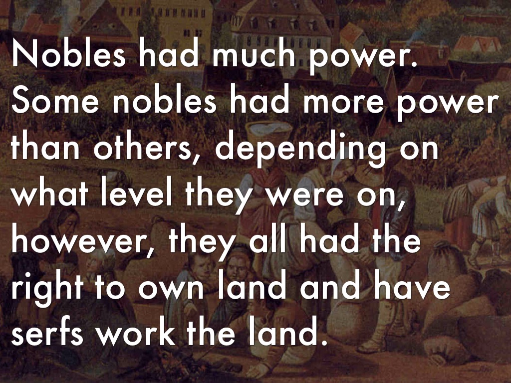 Nobles had much power. Some nobles had more power than others, depending on what level they were on, however, they all had the right to own land and have serfs work the land.