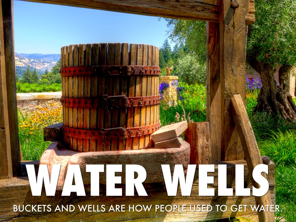 BUCKETS AND WELLS ARE HOW PEOPLE USED TO GET WATER.