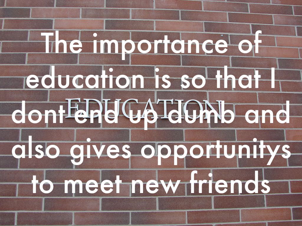The importance of education is so that I dont end up dumb and also gives opportunitys to meet new friends