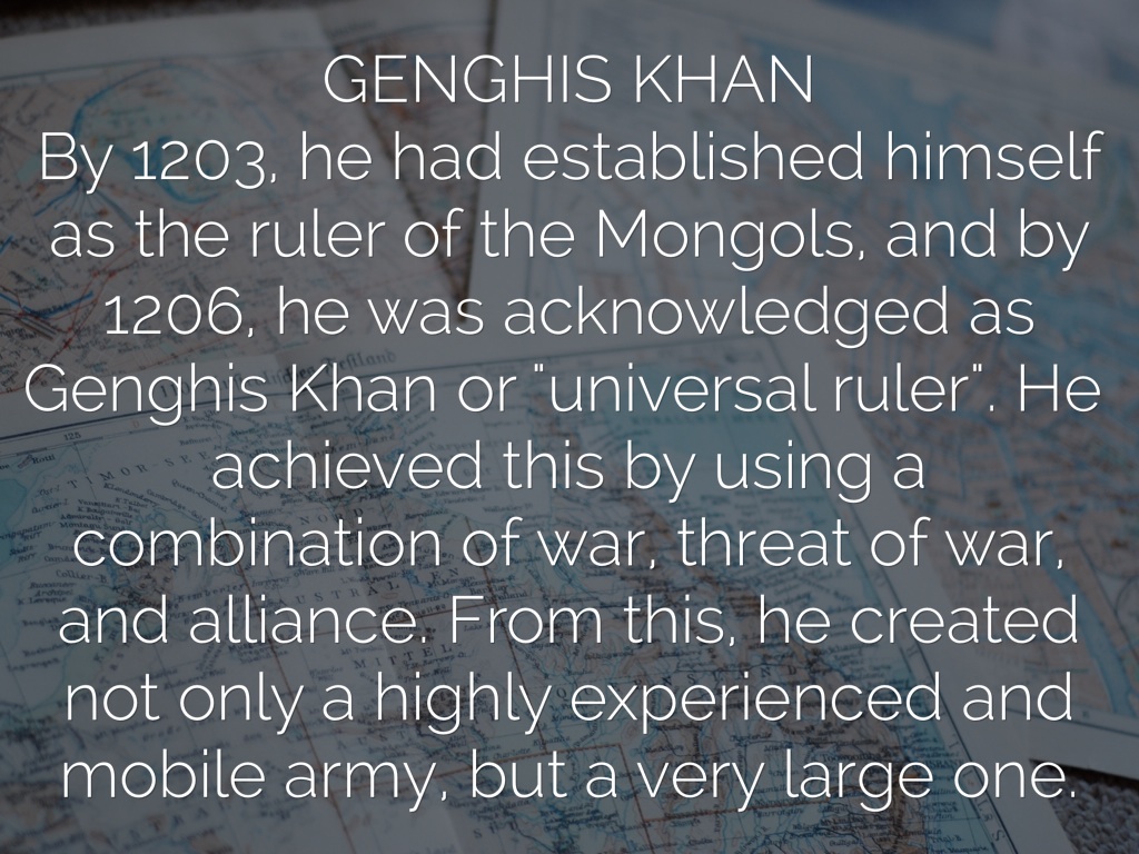 GENGHIS KHAN By 1203, he had established himself as the ruler of the Mongols, and by 1206, he was acknowledged as Genghis Khan or "universal ruler". He achieved this by using a combination of war, threat of war, and alliance. From this, he created not only a highly experienced and mobile army, but a very large one.
