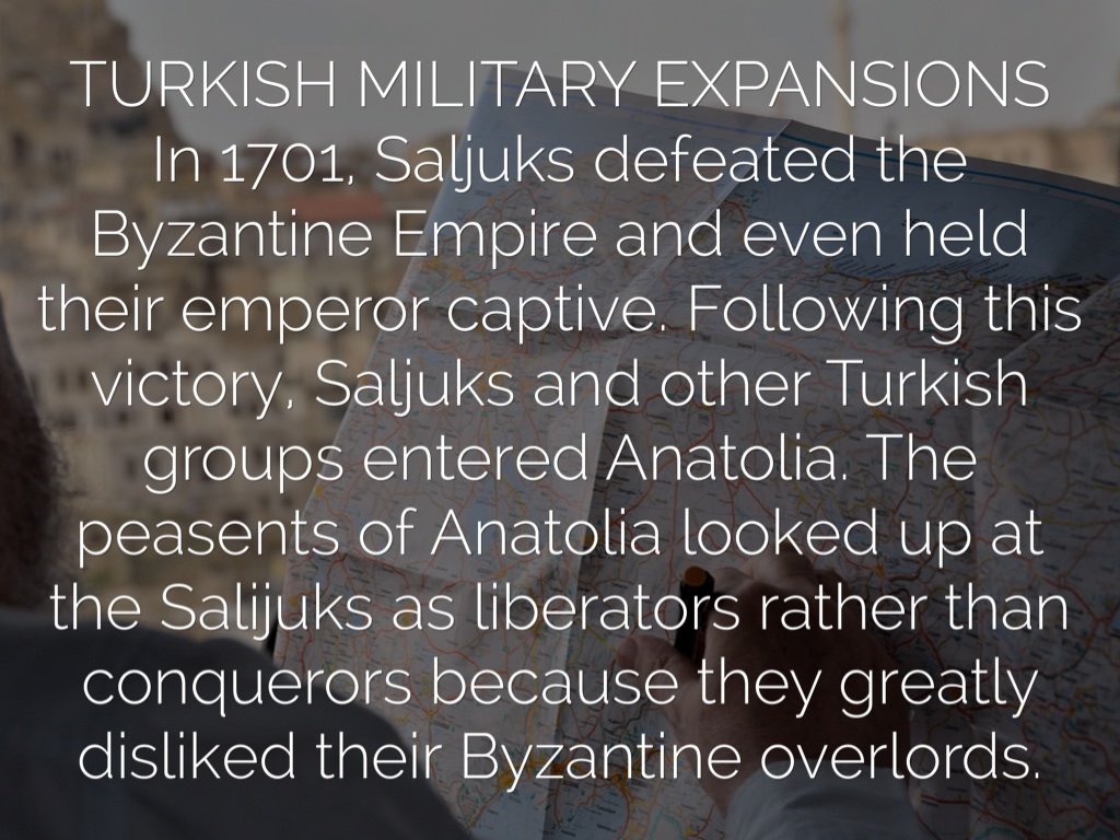 TURKISH MILITARY EXPANSIONS In 1701, Saljuks defeated the Byzantine Empire and even held their emperor captive. Following this victory, Saljuks and other Turkish groups entered Anatolia. The peasents of Anatolia looked up at the Salijuks as liberators rather than conquerors because they greatly disliked their Byzantine overlords.