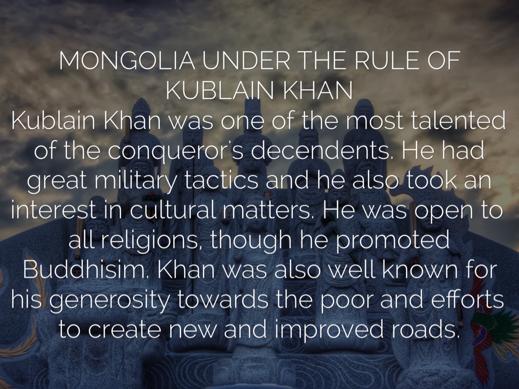 MONGOLIA UNDER THE RULE OF KUBLAIN KHAN Kublain Khan was one of the most talented of the conqueror's decendents. He had great military tactics and he also took an interest in cultural matters. He was open to all religions, though he promoted Buddhisim. Khan was also well known for his generosity towards the poor and efforts to create new and improved roads.