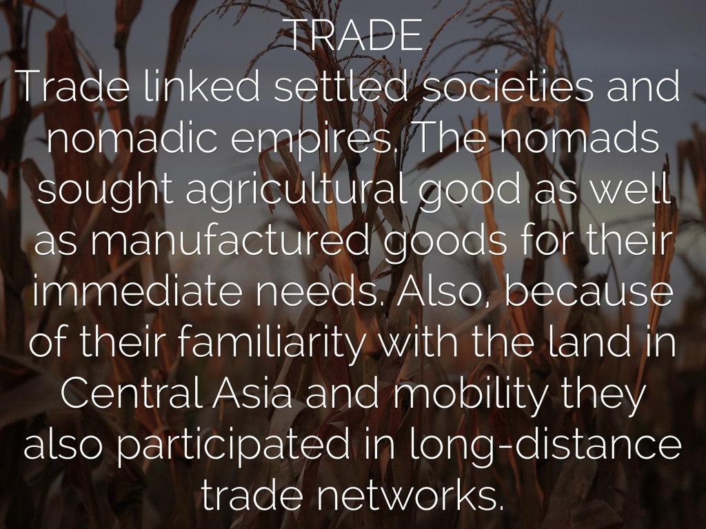 TRADE Trade linked settled societies and nomadic empires. The nomads sought agricultural good as well as manufactured goods for their immediate needs. Also, because of their familiarity with the land in Central Asia and mobility they also participated in long-distance trade networks.