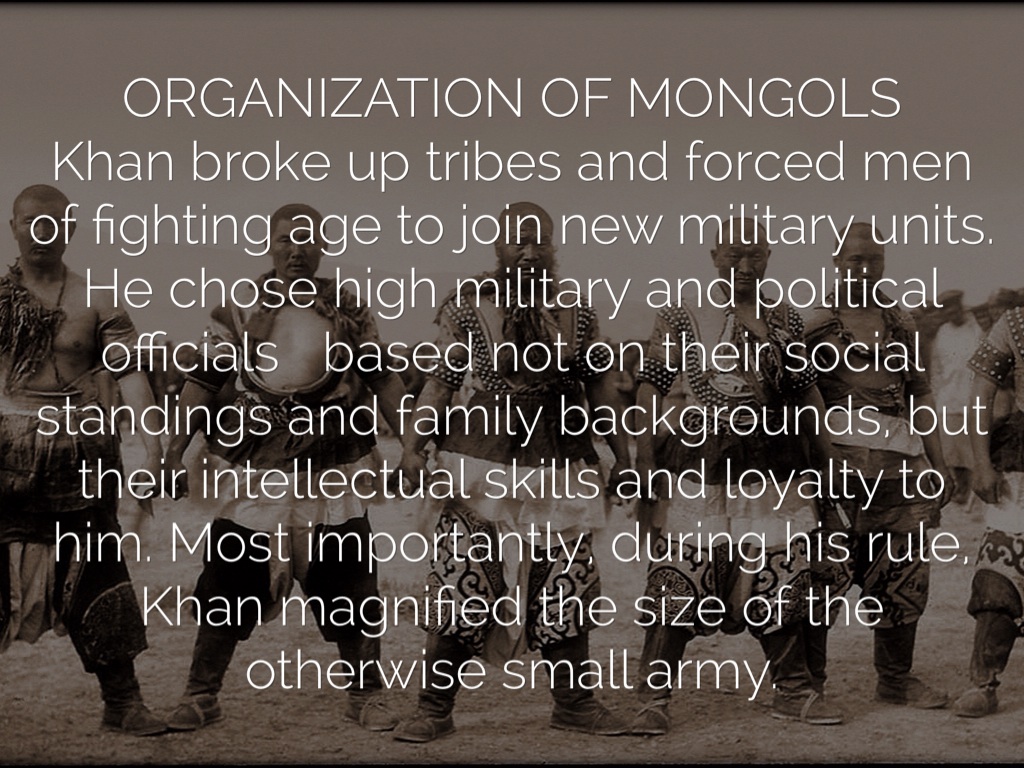 ORGANIZATION OF MONGOLS Khan broke up tribes and forced men of fighting age to join new military units. He chose high military and political officials based not on their social standings and family backgrounds, but their intellectual skills and loyalty to him. Most importantly, during his rule, Khan magnified the size of the otherwise small army.