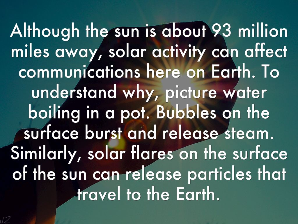 Although the sun is about 93 million miles away, solar activity can affect communications here on Earth. To understand why, picture water boiling in a pot. Bubbles on the surface burst and release steam. Similarly, solar flares on the surface of the sun can release particles that travel to the Earth.