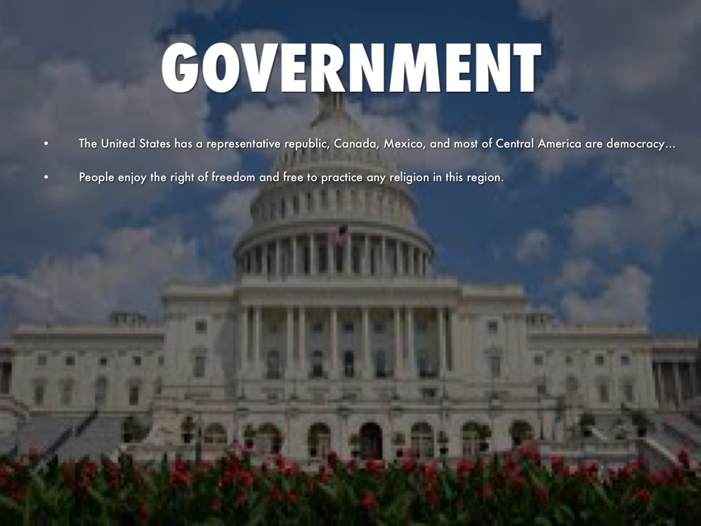 The United States has a representative republic, Canada, Mexico, and most of Central America are democracy governments.