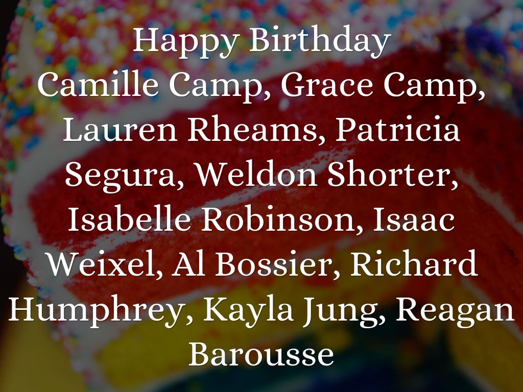 Camille Camp, Grace Camp, Lauren Rheams, Patricia Segura, Weldon Shorter, Isabelle Robinson, Isaac Weixel, Al Bossier, Richard Humphrey, Kayla Jung, Reagan Barousse