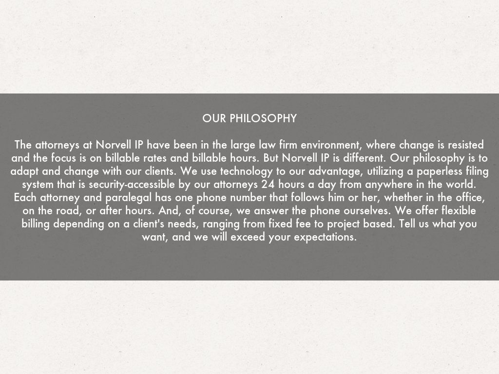 The attorneys at Norvell IP have been in the large law firm environment, where change is resisted and the focus is on billable rates and billable hours. But Norvell IP is different. Our philosophy is to adapt and change with our clients. We use technology to our advantage, utilizing a paperless filing system that is security-accessible by our attorneys 24 hours a day from anywhere in the world. Each attorney and paralegal has one phone number that follows him or her, whether in the office, on the road, or after hours. And, of course, we answer the phone ourselves. We offer flexible billing depending on a client's needs, ranging from fixed fee to project based. Tell us what you want, and we will exceed your expectations.