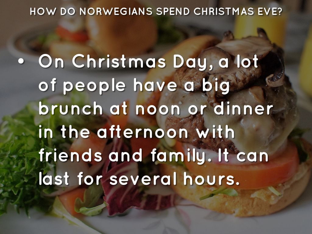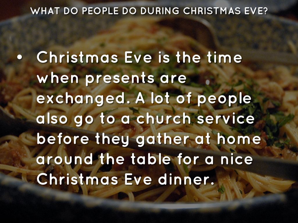 Christmas Eve is the time when presents are exchanged. A lot of people also go to a church service before they gather at home around the table for a nice Christmas Eve dinner.