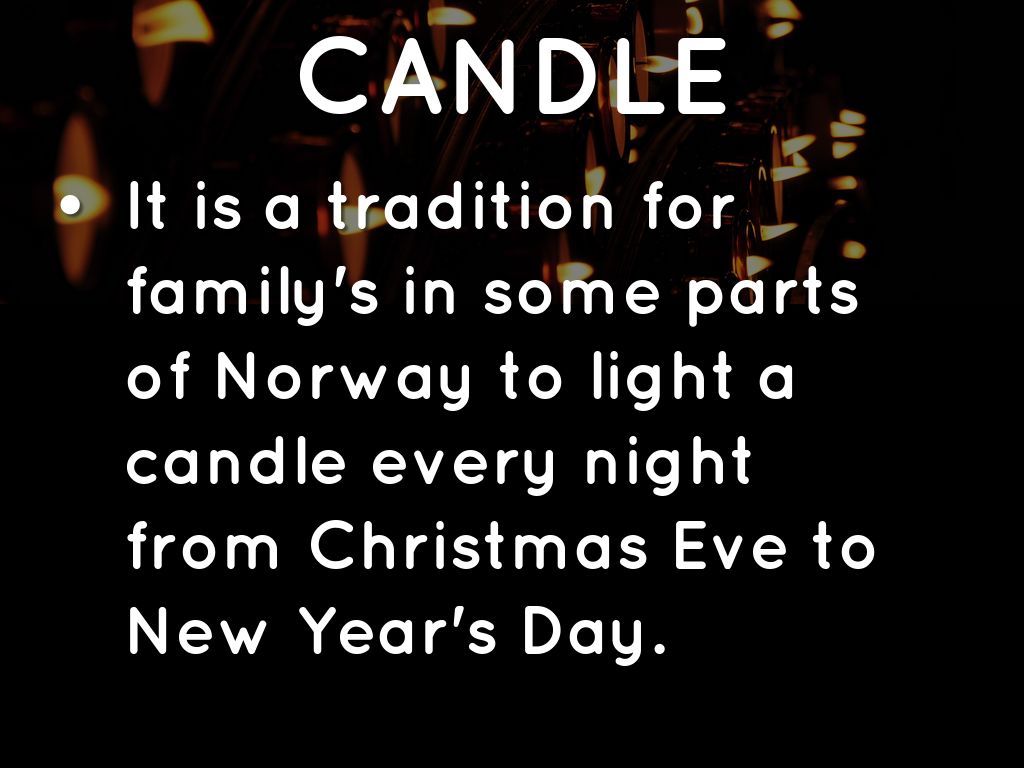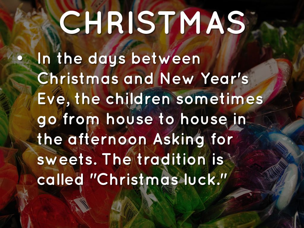 In the days between Christmas and New Year's Eve, the children sometimes go from house to house in the afternoon Asking for sweets. The tradition is called "Christmas luck."