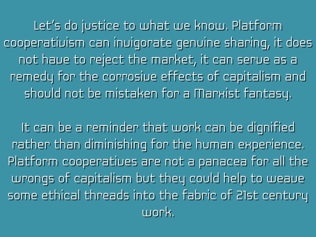 Let’s do justice to what we know. Platform cooperativism can invigorate genuine sharing, it does not have to reject the market, it can serve as a remedy for the corrosive effects of capitalism and should not be mistaken for a Marxist fantasy.