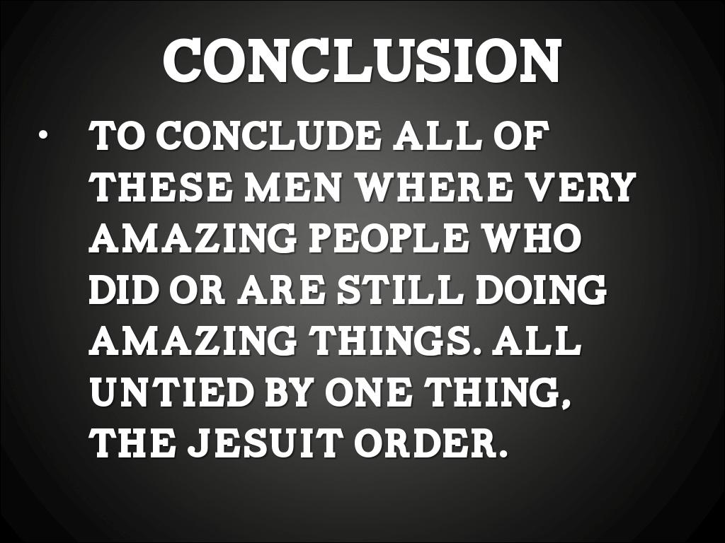 TO CONCLUDE ALL OF THESE MEN WHERE VERY AMAZING PEOPLE WHO DID OR ARE STILL DOING AMAZING THINGS. ALL UNTIED BY ONE THING, THE JESUIT ORDER.