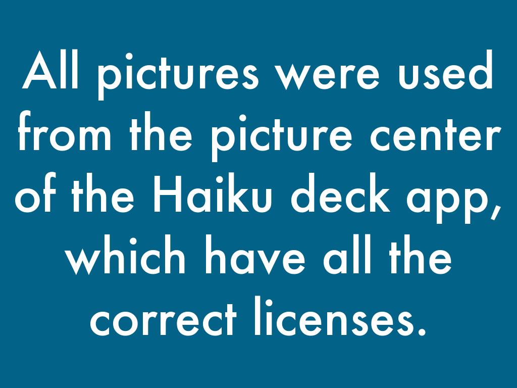 All pictures were used from the picture center of the Haiku deck app, which have all the correct licenses.