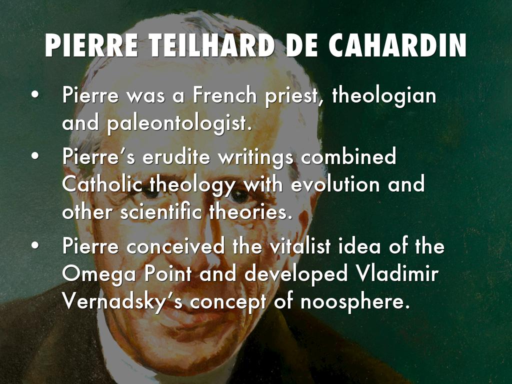 • Pierre conceived the vitalist idea of the Omega Point and developed Vladimir Vernadsky’s concept of noosphere.