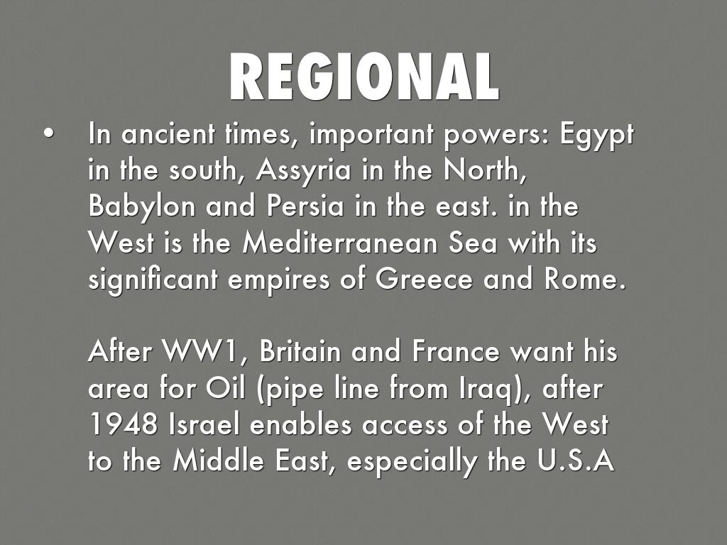 In ancient times, important powers: Egypt in the south, Assyria in the North, Babylon and Persia in the east. in the West is the Mediterranean Sea with its significant empires of Greece and Rome.