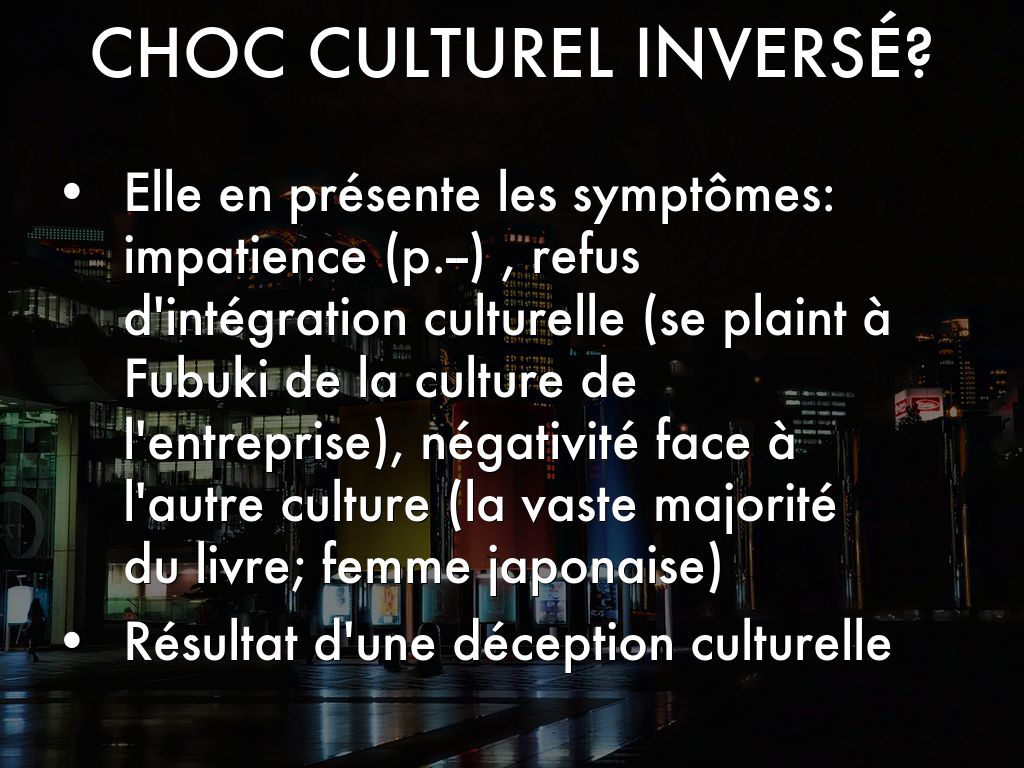 Elle en présente les symptômes: impatience (p.--) , refus d'intégration culturelle (se plaint à Fubuki de la culture de l'entreprise), négativité face à l'autre culture (la vaste majorité du livre; femme japonaise)