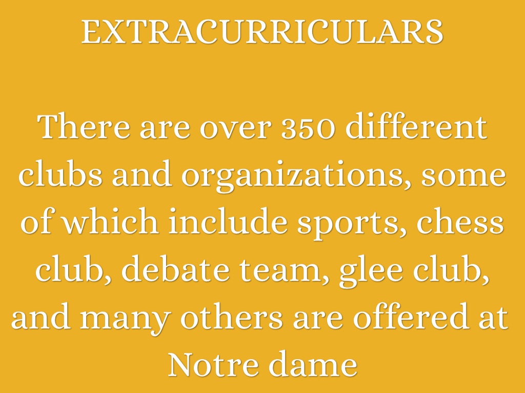There are over 350 different clubs and organizations, some of which include sports, chess club, debate team, glee club, and many others are offered at Notre dame