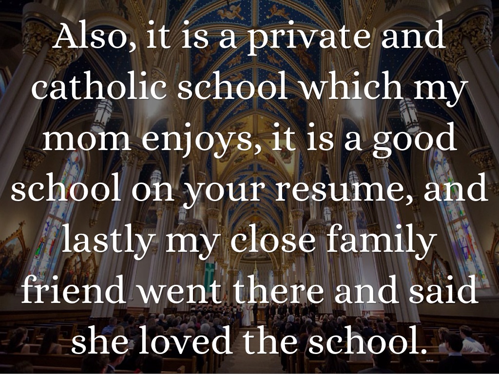 Also, it is a private and catholic school which my mom enjoys, it is a good school on your resume, and lastly my close family friend went there and said she loved the school.