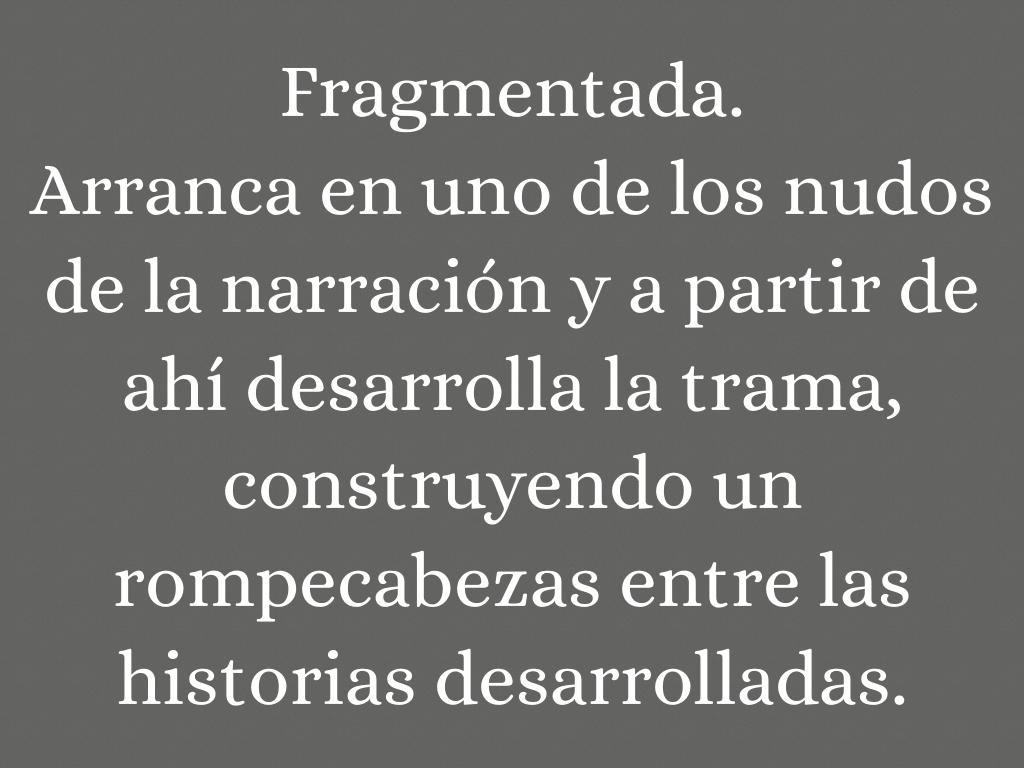 Arranca en uno de los nudos de la narración y a partir de ahí desarrolla la trama, construyendo un rompecabezas entre las historias desarrolladas.