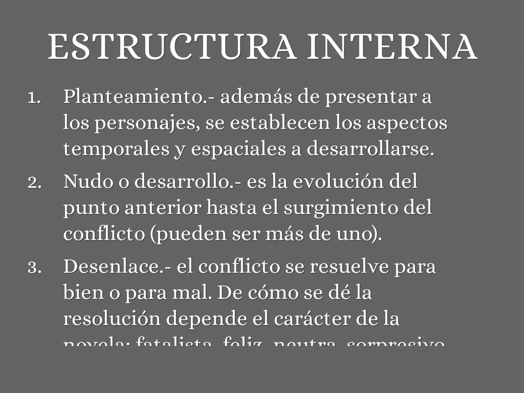 - Desenlace.- el conflicto se resuelve para bien o para mal. De cómo se dé la resolución depende el carácter de la novela; fatalista, feliz, neutra, sorpresivo.
