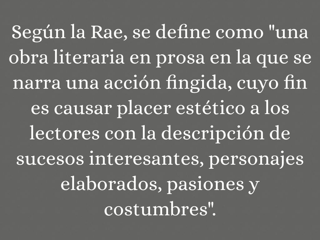 Según la Rae, se define como "una obra literaria en prosa en la que se narra una acción fingida, cuyo fin es causar placer estético a los lectores con la descripción de sucesos interesantes, personajes elaborados, pasiones y costumbres".