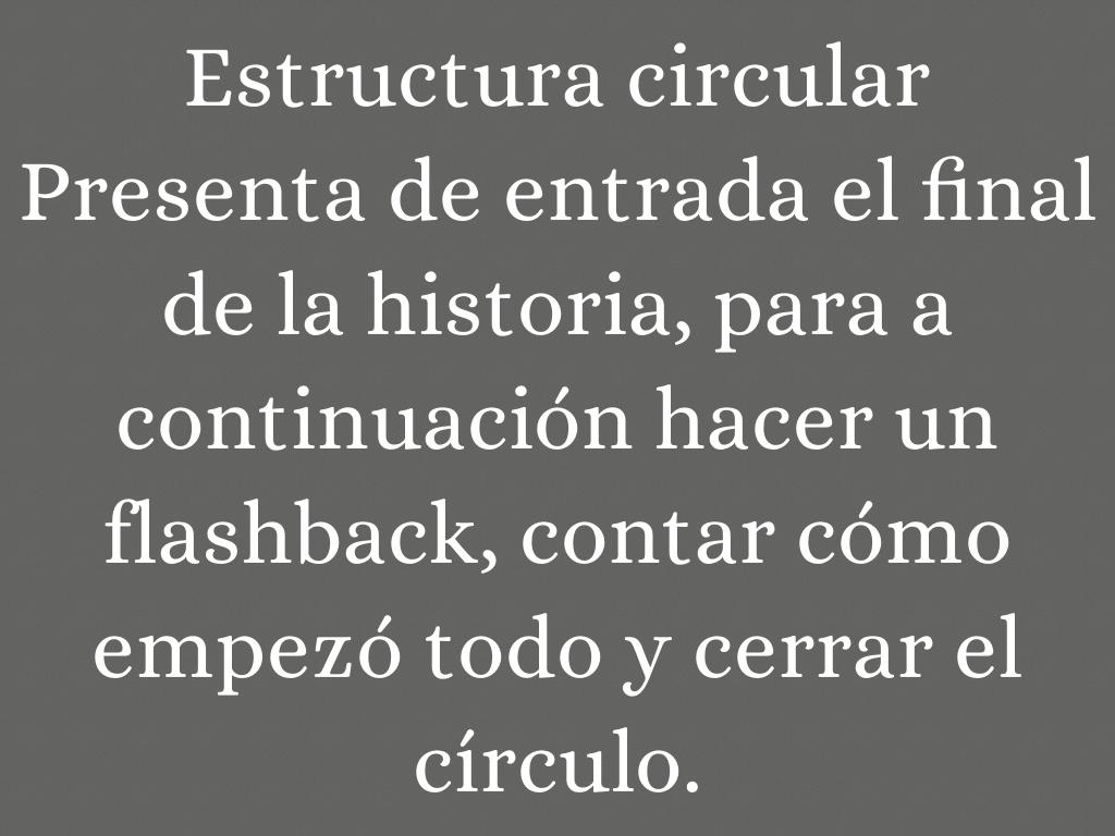 Presenta de entrada el final de la historia, para a continuación hacer un flashback, contar cómo empezó todo y cerrar el círculo.