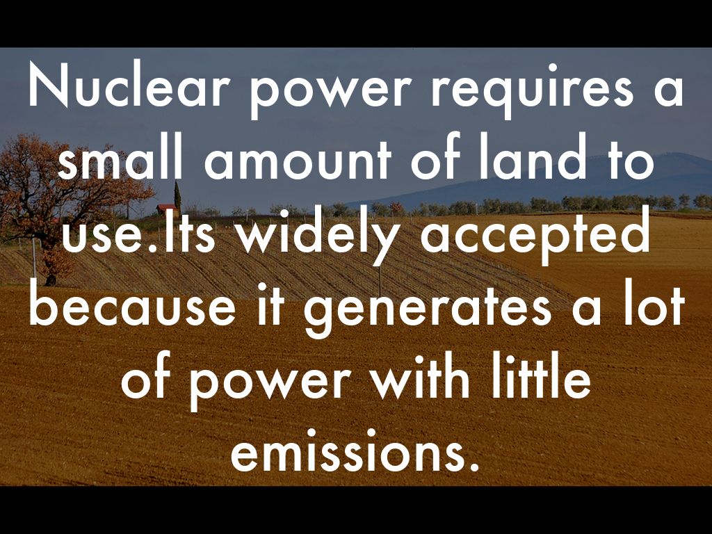 Nuclear power requires a small amount of land to use.Its widely accepted because it generates a lot of power with little emissions.
