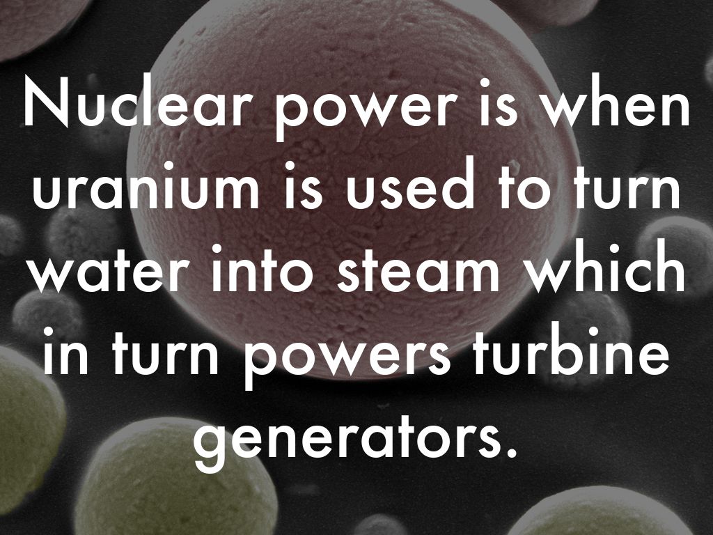 Nuclear power is when uranium is used to turn water into steam which in turn powers turbine generators.