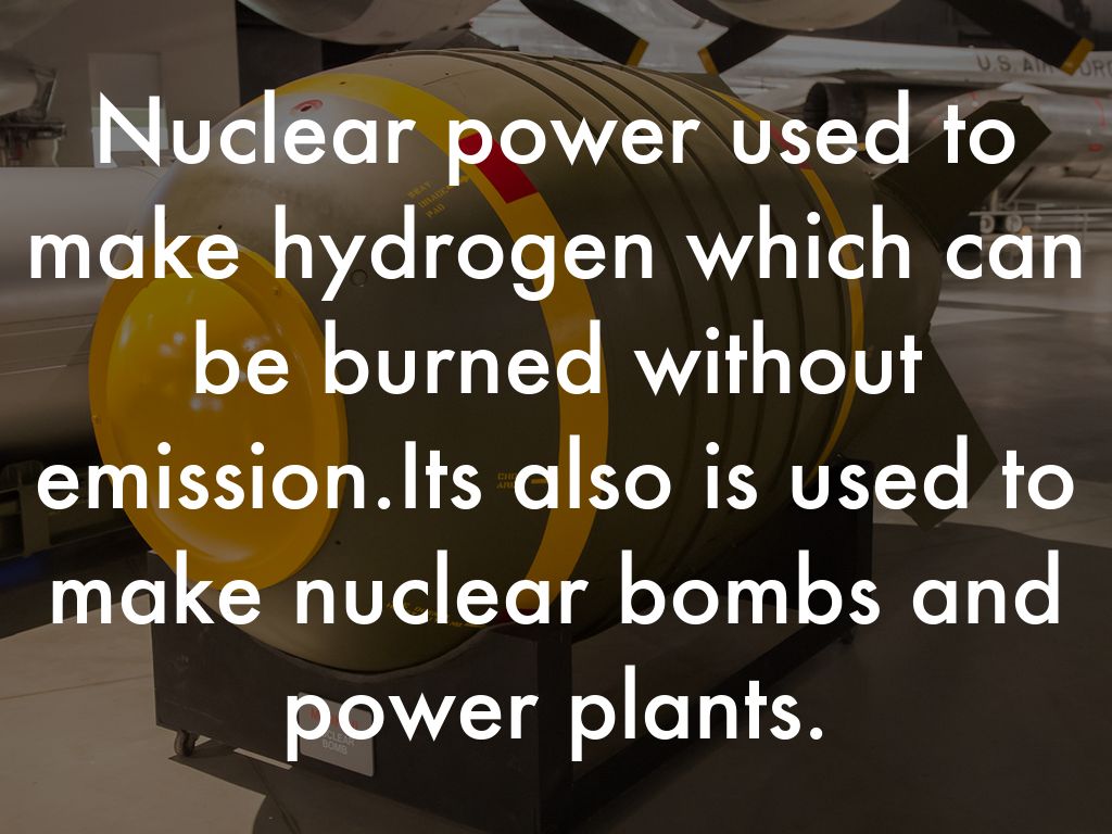 Nuclear power used to make hydrogen which can be burned without emission.Its also is used to make nuclear bombs and power plants.