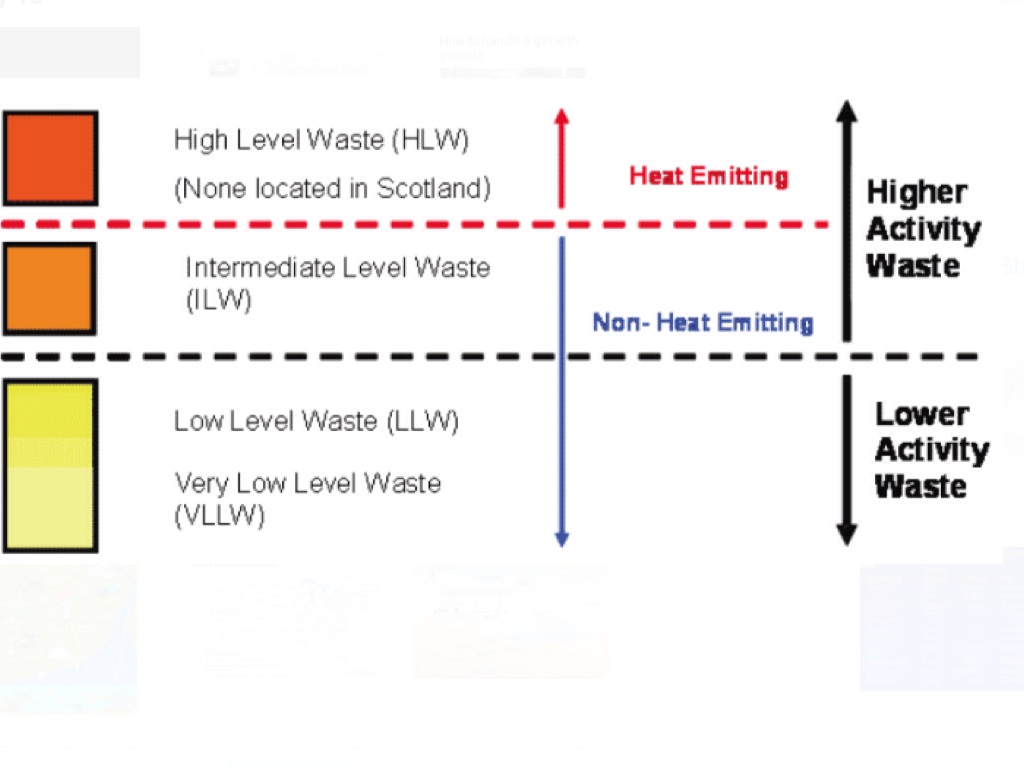 High level waste-very high radioactive, takes a long time to decay and has the issue of storage