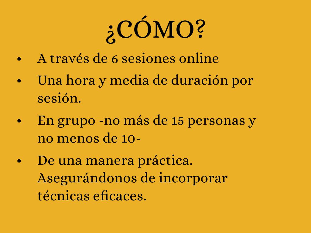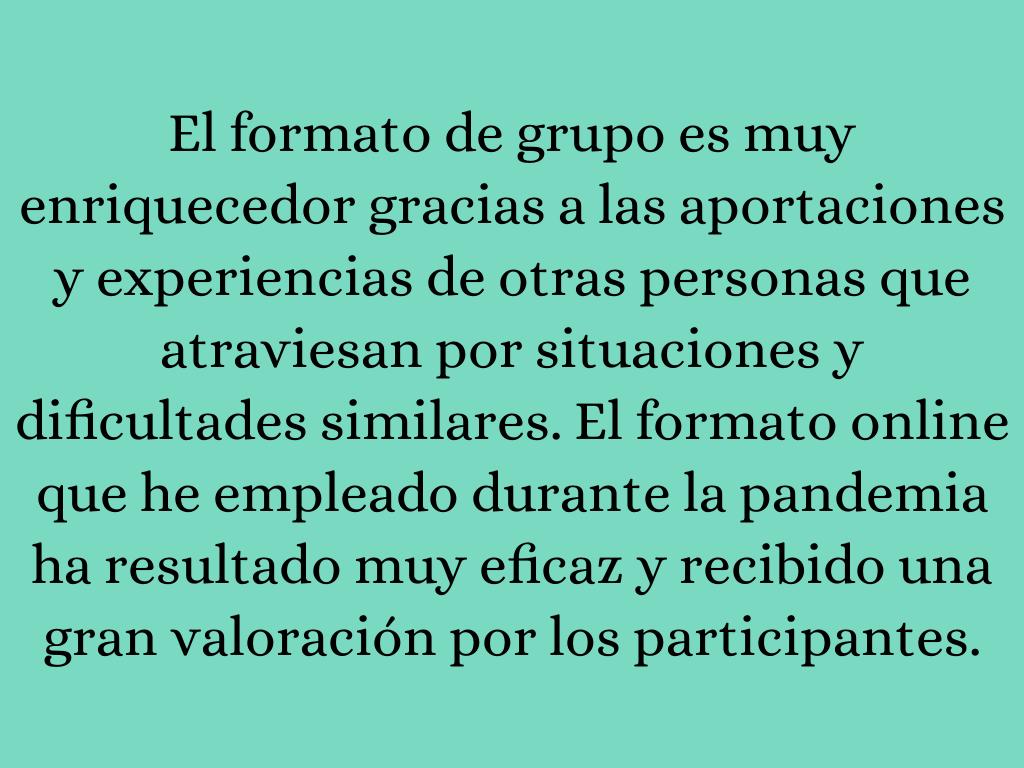 El formato de grupo es muy enriquecedor gracias a las aportaciones y experiencias de otras personas que atraviesan por situaciones y dificultades similares. El formato online que he empleado durante la pandemia ha resultado muy eficaz y recibido una gran valoración por los participantes.