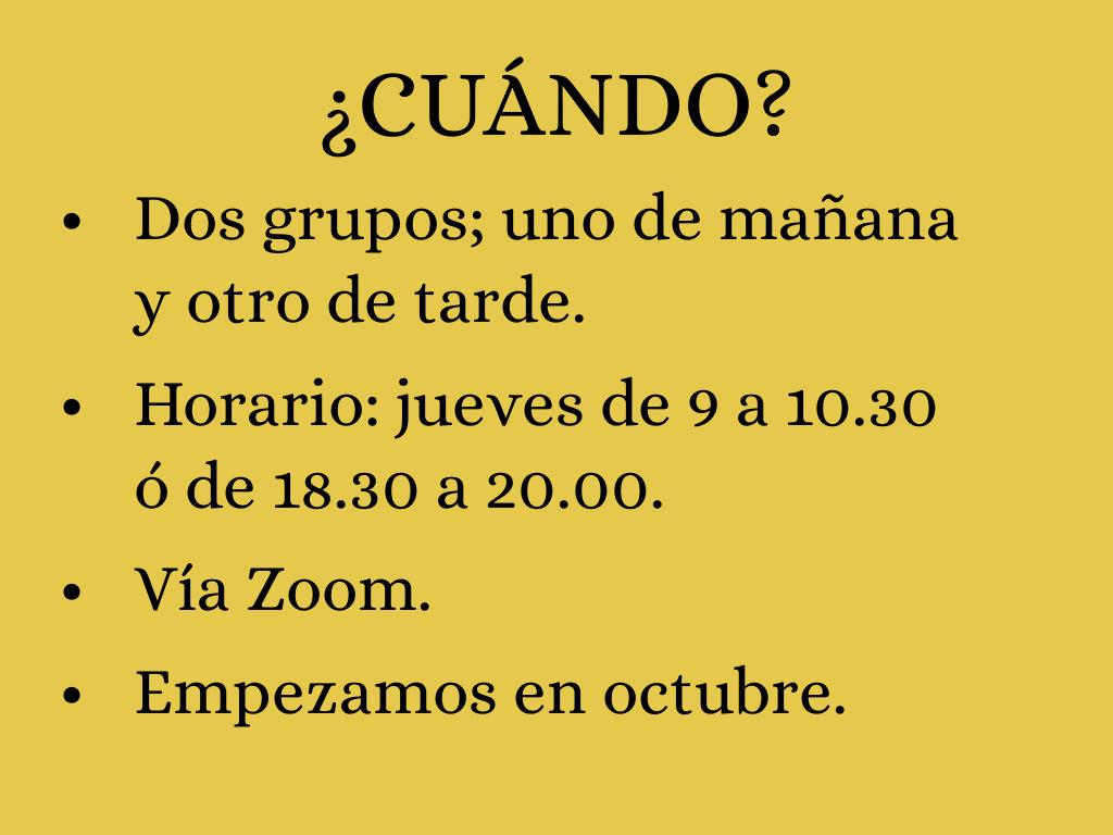 - Horario: jueves de 9 a 10.30 ó de 18.30 a 20.00.