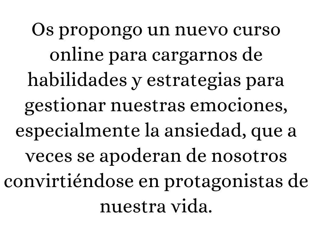 Os propongo un nuevo curso online para cargarnos de habilidades y estrategias para gestionar nuestras emociones, especialmente la ansiedad, que a veces se apoderan de nosotros convirtiéndose en protagonistas de nuestra vida.