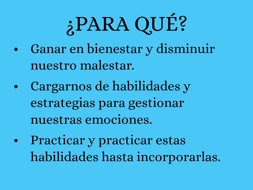 - Cargarnos de habilidades y estrategias para gestionar nuestras emociones.