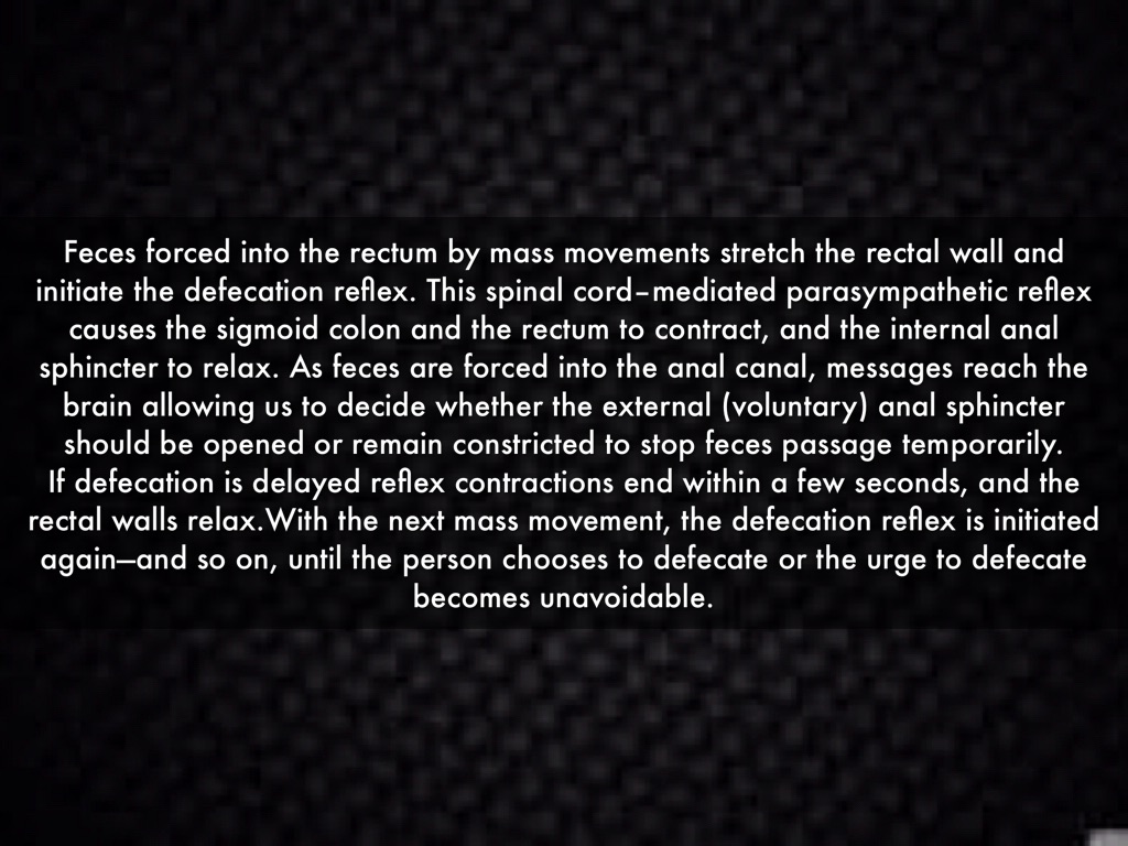 Feces forced into the rectum by mass movements stretch the rectal wall and initiate the defecation reflex. This spinal cord–mediated parasympathetic reflex causes the sigmoid colon and the rectum to contract, and the internal anal sphincter to relax. As feces are forced into the anal canal, messages reach the brain allowing us to decide whether the external (voluntary) anal sphincter should be opened or remain constricted to stop feces passage temporarily.