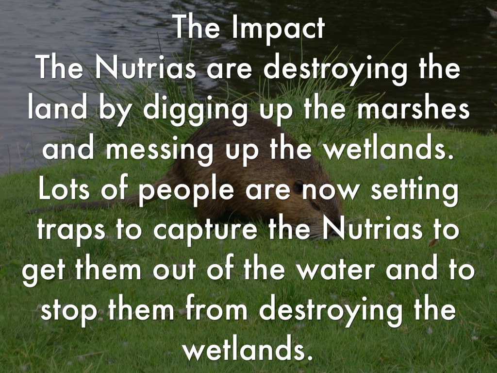 The Impact The Nutrias are destroying the land by digging up the marshes and messing up the wetlands. Lots of people are now setting traps to capture the Nutrias to get them out of the water and to stop them from destroying the wetlands.