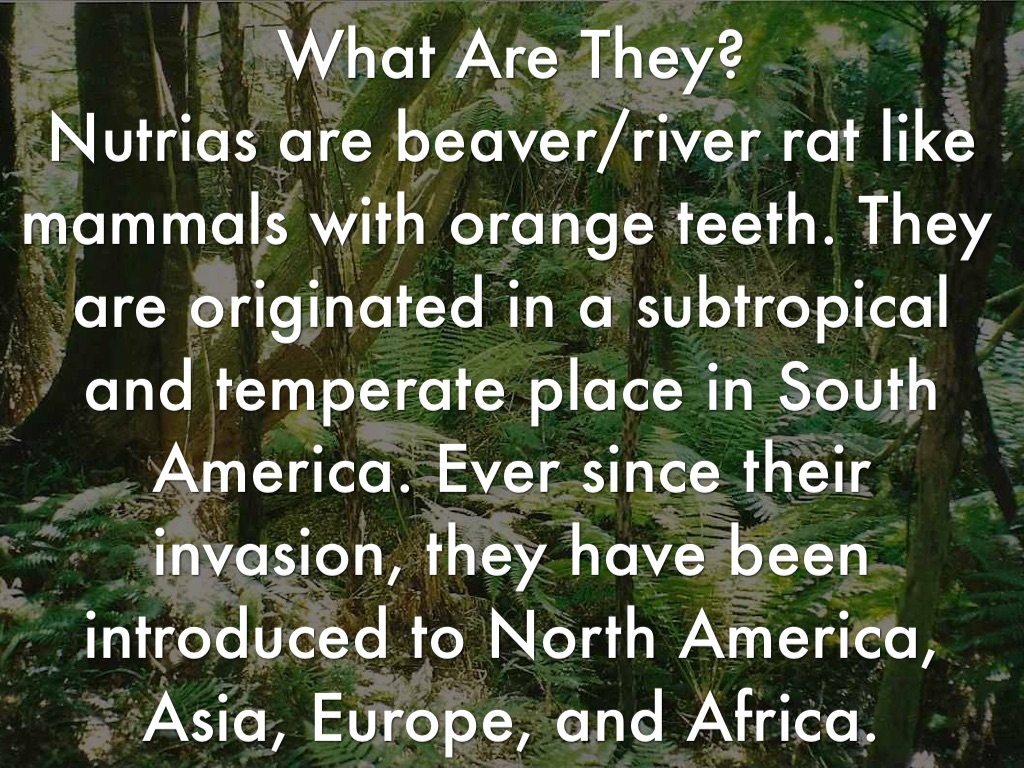 What Are They? Nutrias are beaver/river rat like mammals with orange teeth. They are originated in a subtropical and temperate place in South America. Ever since their invasion, they have been introduced to North America, Asia, Europe, and Africa.
