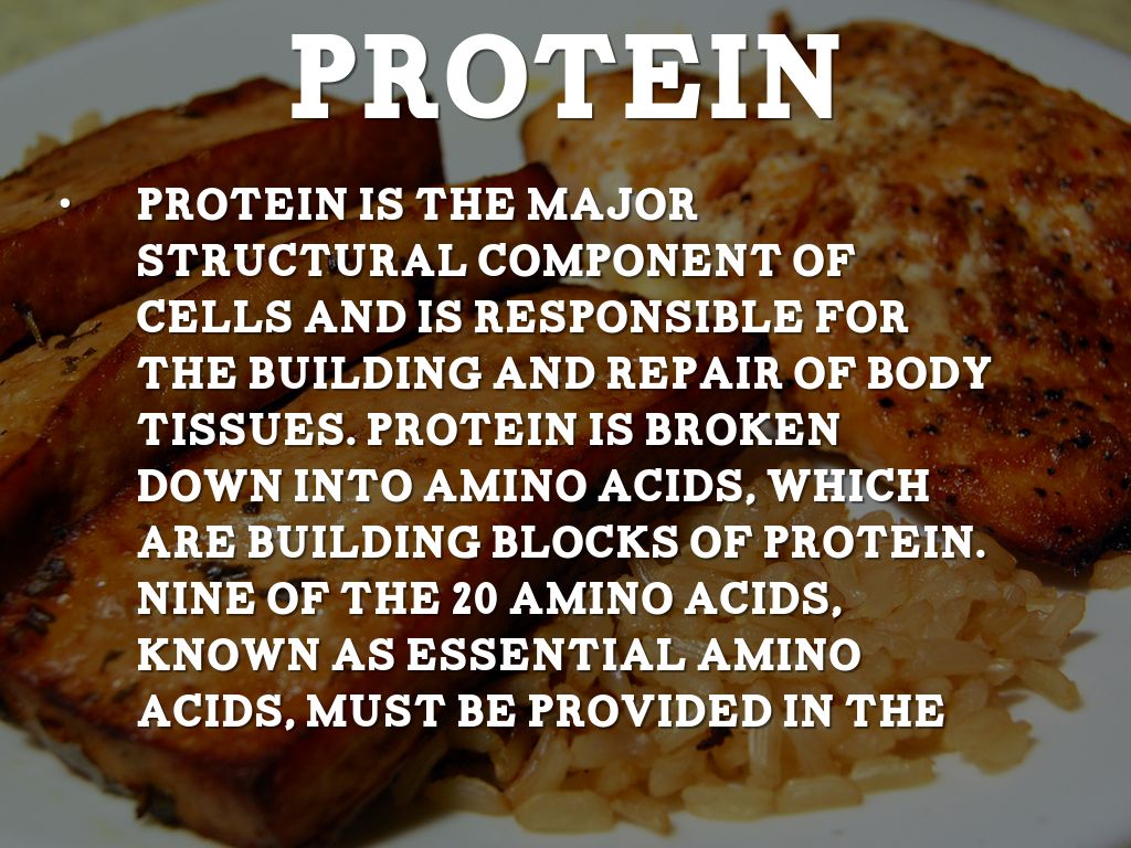 Protein is the major structural component of cells and is responsible for the building and repair of body tissues. Protein is broken down into amino acids, which are building blocks of protein. Nine of the 20 amino acids, known as essential amino acids, must be provided in the diet as they cannot be synthesized in the body. Ten to 35 percent of your daily calories should come from lean protein sources such as low-fat meat, dairy, beans or eggs.