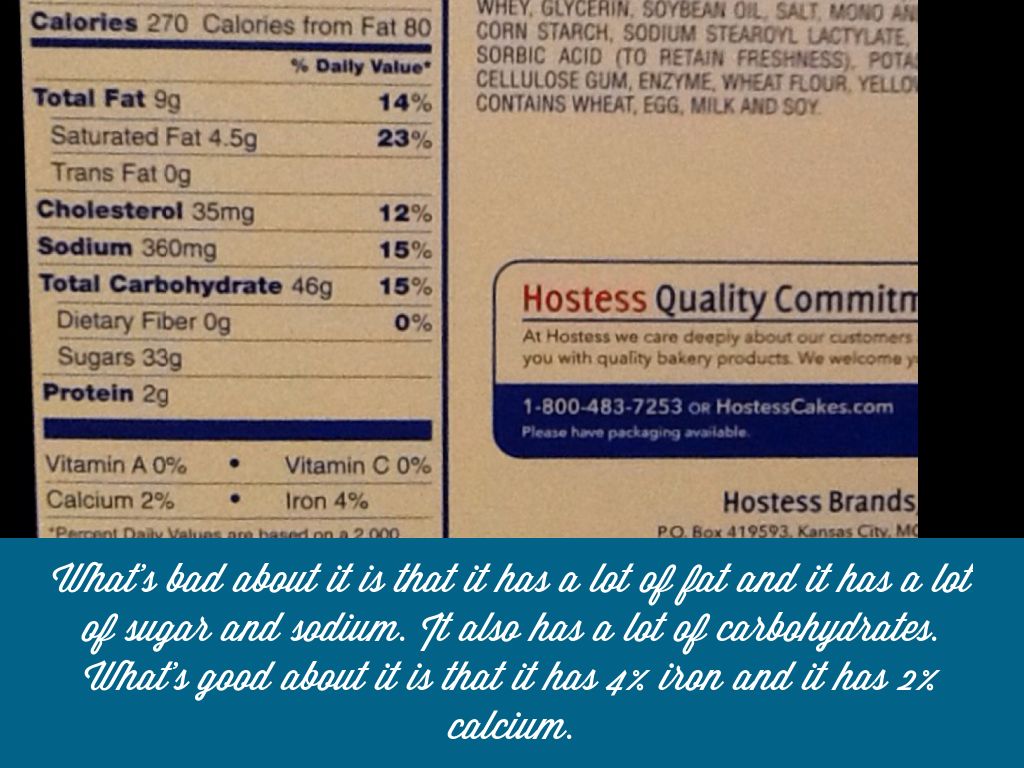 What's bad about it is that it has a lot of fat and it has a lot of sugar and sodium. It also has a lot of carbohydrates. What's good about it is that it has 4% iron and it has 2% calcium.