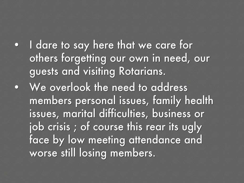 We overlook the need to address members personal issues, family health issues, marital difficulties, business or job crisis ; of course this rear its ugly face by low meeting attendance and worse still losing members.