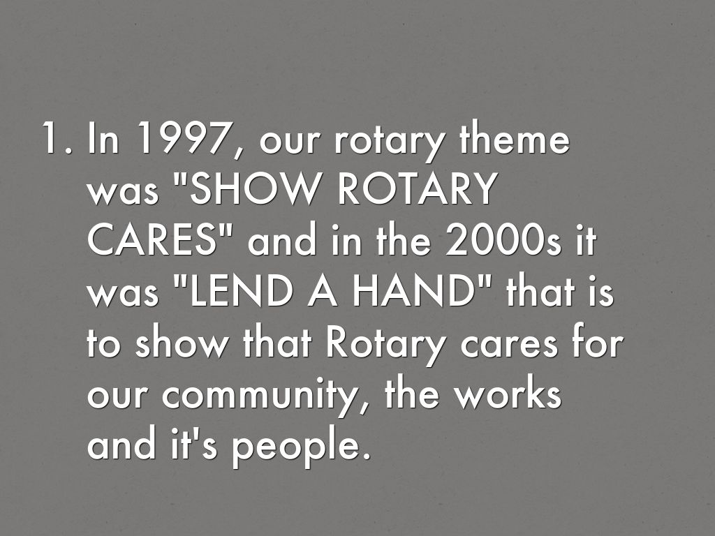In 1997, our rotary theme was "SHOW ROTARY CARES" and in the 2000s it was "LEND A HAND" that is to show that Rotary cares for our community, the works and it's people.
