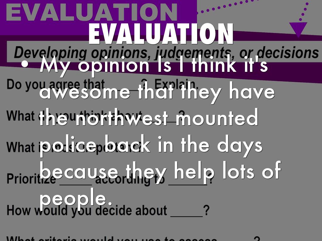 My opinion Is I think it's awesome that they have the northwest mounted police back in the days because they help lots of people.