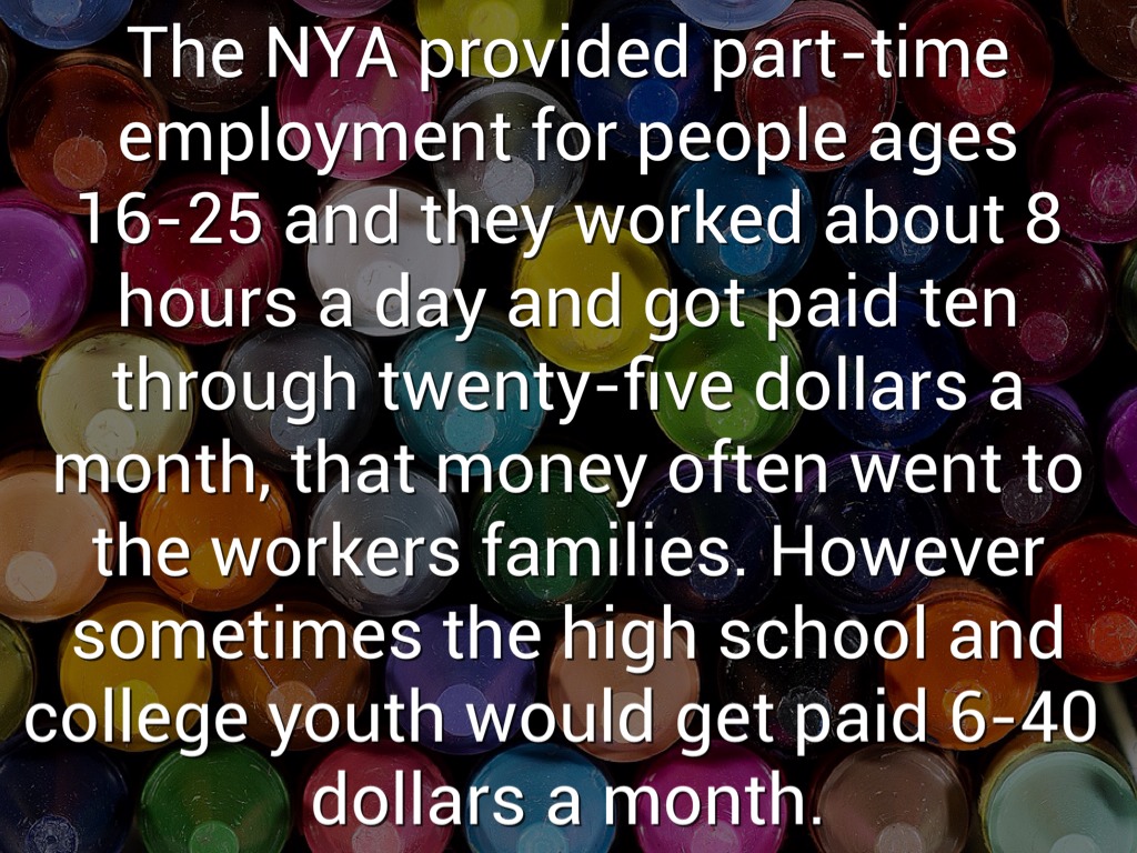 The NYA provided part-time employment for people ages 16-25 and they worked about 8 hours a day and got paid ten through twenty-five dollars a month, that money often went to the workers families. However sometimes the high school and college youth would get paid 6-40 dollars a month.